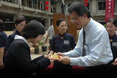 Franky O. Widjaja, Wakil Ketua Yayasan Buddha Tzu Chi Indonesia yang juga Penanggung Jawab Misi Pendidikan Tzu Chi memberikan tumpeng kepada Iing Felicia, Kepala TK Tzu Chi School dalam Acara Syukuran Topping Off (pemasangan atap) SD Tzu Chi pada Minggu, 14 November 2010.Fotografer : Hadianto Kurniawan (He Qi Timur)