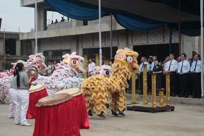 Acara Syukurang Topping Off (pemasangan atap) Sekolah Dasar Tzu Chi ini dibuka dengan genderang dan tarian barongsai.Fotografer : Feranika Husodo (He Qi Utara)