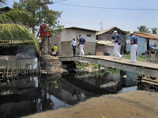 Untuk menuju ke beberapa rumah pasien, para relawan harus naik getek menyeberang kali yang hitam pekat dan berbau tidak nyaman, walau demikian senyuman tetap dibawa serta.