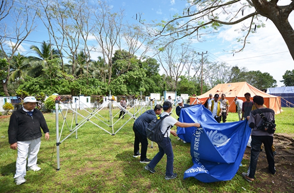 Relawan Tzu Chi Indonesia dibantu warga setempat mendirikan tenda untuk layanan kesehatan di halaman Kantor Kecamatan Pondidaha, Konawe, Sulawesi Tenggara.