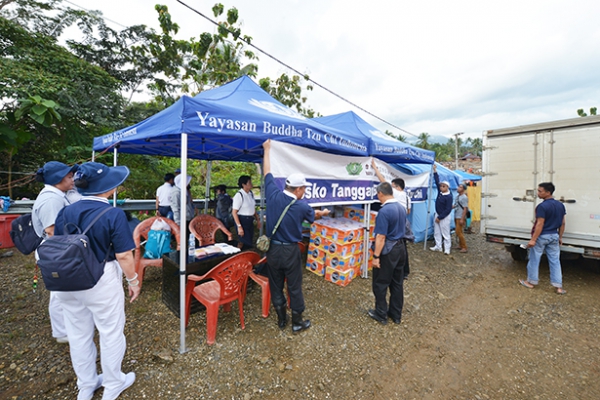 Satu persatu kupon dari Tzu Chi Indonesia untuk warga dibagikan sebelum menerima paket bantuan darurat di beberapa titik lokasi pengungsian.