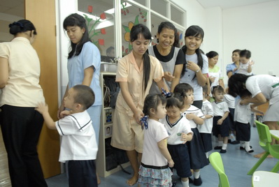 Lorong kelas playgroup mulai sepi dari para orang tua siswa dan baby sitter. Perlahan-lahan diharapkan anak-anak tidak lagi ditunggu oleh orang tuanya.Fotografer : Anand Yahya