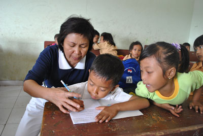 Di dalam kelas relawan Tzu Chi berbaur dengan murid sekolah, salah satunya mengajar mereka untuk membaca dan menulis.Fotografer : Juliana Santy