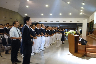 Seluruh peserta traning secara serentak membacakan janji ikrar Tzu Chi yang bertekad menjalankan keempat misi Tzu Chi di dalam kehidupannya.Fotografer : Veronika Usha
