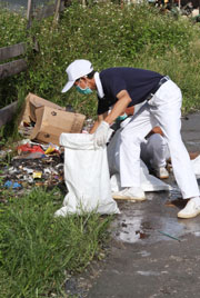 Salah satu relawan, Ade Kamaruddin Shixiong yang bekerja tanpa kenal lelah membersihkan sampah yang bertebaran di area ini. Gerakan yang lincah dan telaten membuat pekerjaan besar seperti ini dapat diselesaikan dalam waktu yang singkat.Fotografer : Nining Tanuria (Tzu Chi Biak)