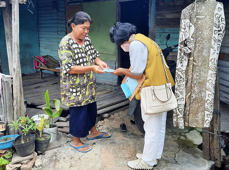 Anna Suryana sedang memberikan kupon kepada salah satu warga Kota Baru, Tanjung Karang Timur yang rumahnya berada di dekat pegunungan.