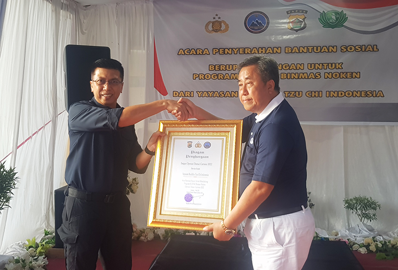 Komisaris Besar Polisi Muhammad Firman,S.I.K. menyerahkan piagam penghargaan kepada Yayasan Buddha Tzu Chi Indonesia yang diterima Susanto Pirono Ketua Tzu Chi Hu Ai Papua dan Papua Barat.