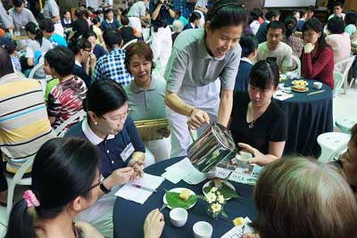 Dengan gerakan yang anggun dan halus, Lim Ai Ru Shijie memeragakan salah satu keindahan budaya humanis Tzu Chi, yaitu tata krama menyajikan teh. Fotografer : Jodie Lienardy (He Qi Utara)