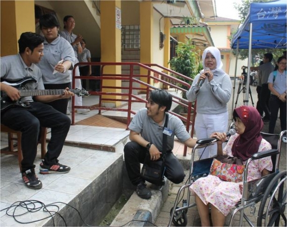 KOLABORASI. Staf DAAI TV Indonesia menunjukkan kebolehan bersama salah seorang oma untuk menghibur panti.Fotografer : Fammy (He Qi Timur)