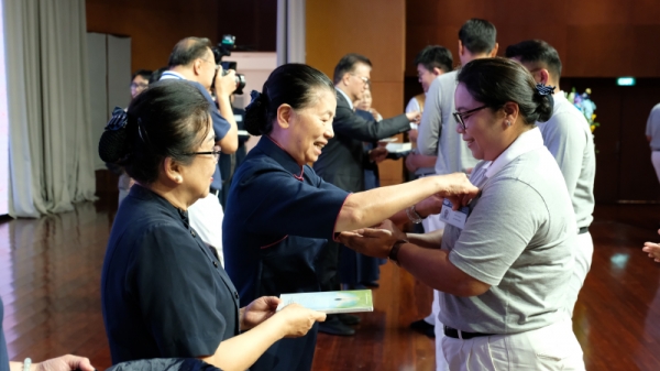 Ketua Yayasan Buddha Tzu Chi Indonesia Liu Su Mei menyematkan name tag kepada 208 relawan Tzu Chi dari He Xin 1 (Jabodetabek) dan Tzu Chi Cabang Sinar Mas setelah dua hari mengikuti pelatihan.
