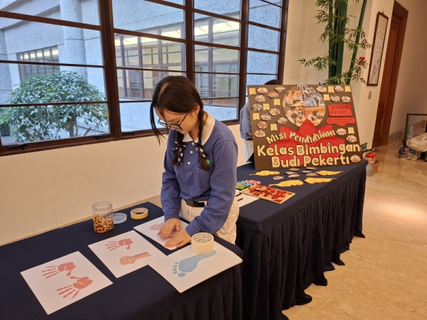 Di sudut lain, Fiorenza (Tzu Ching) dengan semangat menyiapkan berbagai permainan edukatif di stan kelas bimbingan budi pekerti untuk memberikan keceriaan dan pesan moral bagi para tamu.