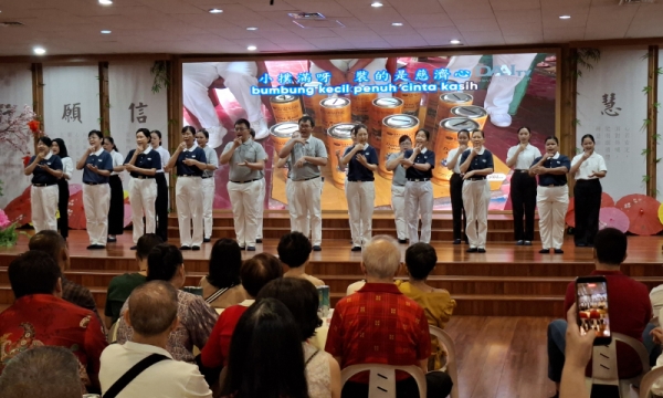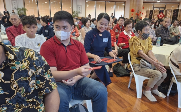 Penuh rasa hormat, relawan menyerahkan angpao yang dihiasi koin perak bertuliskan angka 60, menandai peringatan HUT ke-60 Tzu Chi dalam menyebarkan cinta kasih yang tiada henti ke seluruh penjuru dunia.