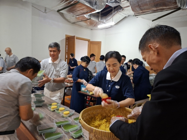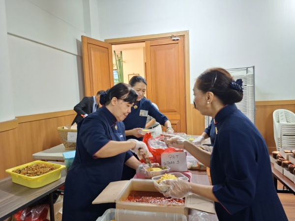 Memasuki hari pelaksanaan, sentuhan kasih relawan terlihat saat Man Ling (kedua dari kanan) dan tim konsumsi dengan telaten menyiapkan nasi kuning vegetarian beralaskan daun pisang sebagai jamuan hangat bagi para tamu.