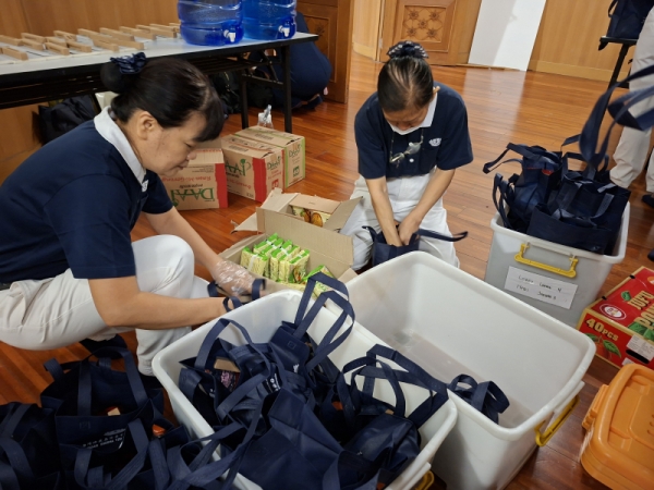 Setelah paket hidangan siap, relawan lainnya dengan sigap memasukkan souvenir dan mi instan DAAI ke dalam tas spunbond sebagai tanda terima kasih dan kenang-kenangan penuh berkah bagi para tamu yang hadir.