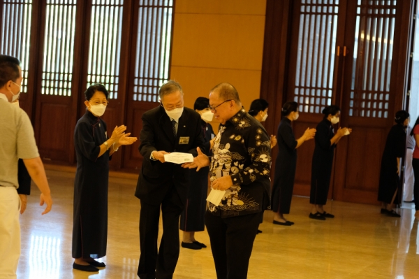 Relawan Komite Tzu Chi yang bertugas dalam penerimaan tamu undangan mendampingi para tamu yang datang dalam suasana penyambutan oleh relawan Tzu Chi.