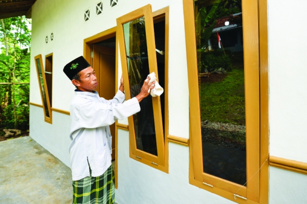 Rasman (53) warga Desa Somakaton, salah satu warga penerima bantuan renovasi, dengan rasa syukur sedang membersihkan jendela rumahnya yang telah selesai direnovasi. Ia mengungkapkan rasa syukur dan harapannya. Di Desa Somakaton sendiri, terdapat 21 Kepala Keluarga (KK) yang akan menerima manfaat dari program renovasi rumah tidak layak huni.
