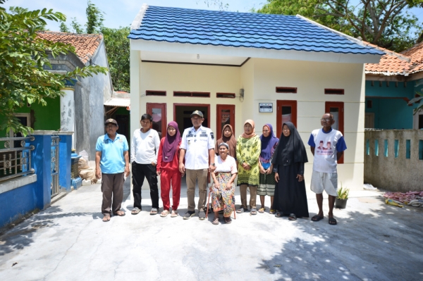 Kepala Desa Patramanggala, Jayadi dan sejumlah warga berfoto bersama di depan rumah salah satu warga penerima bantuan renovasi rumah oleh Tzu Chi Indonesia dan ASG di Kabupaten Tangerang.