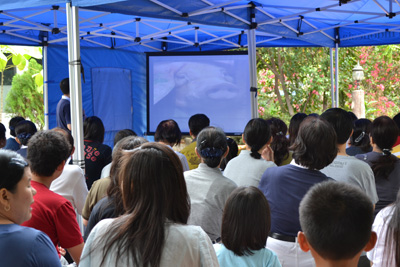 Relawan Tzu Chi mensosialisasikan pelestarian lingkungan dan gaya hidup vegetarian kepada warga dengan menayangkan video mengenai kekejaman yang terjadi di peternakan. Fotografer : Cindy Kusuma