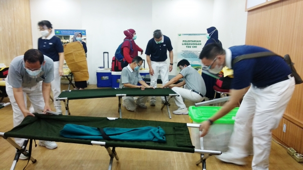 Sejumlah relawan Tzu Chi yang bertugas di bagian logistik dengan sigap menggotong berbagai perlengkapan dari bus PMI. Salah satunya adalah merakit velbed yang terlipat serta meletakkan kasur dan bantal di atasnya.