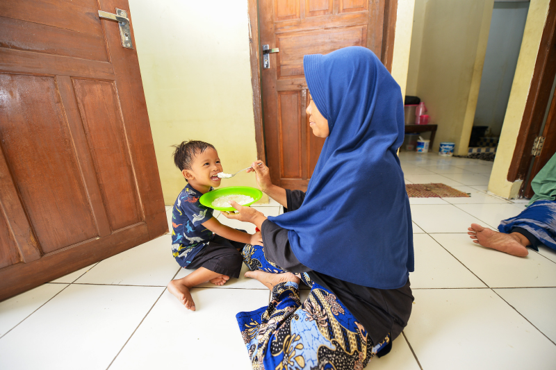 Siti Melani menyuapi makan salah satu anaknya. Kini, setelah rumahnya direnovasi oleh Tzu Chi Indonesia dan ASG keluarga ini dapat tersenyum bahagia saat melakukan aktivitas di rumah.