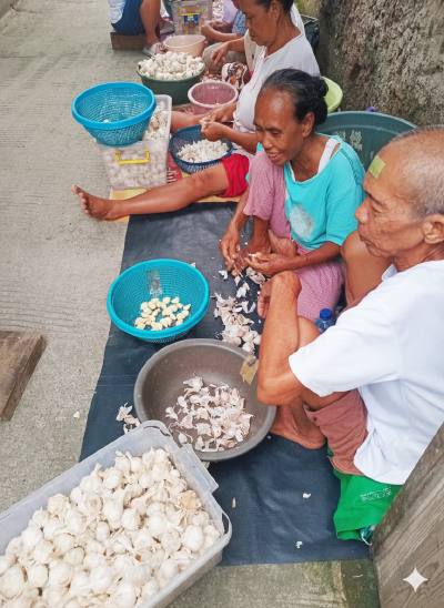 Utin dan Kilah saat bekerja serabutan sebagai pengupas bawang putih di dekat rumahnya yang berlokasi di Desa Teluknaga, Kecamatan Teluknaga, Kabupaten Tangerang.