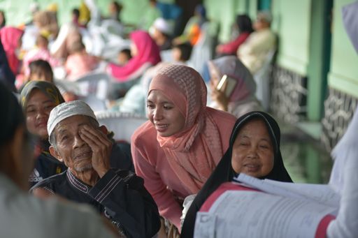 Senyum dan kebahagiaan terpancar di wajah Rodiah (kanan) dan Sahro (kiri) ketika usai menjalani operasi katarak. Sementara itu Eva (tengah) menahan haru karena melihat ibu dan kakeknya kembali bisa melihat.