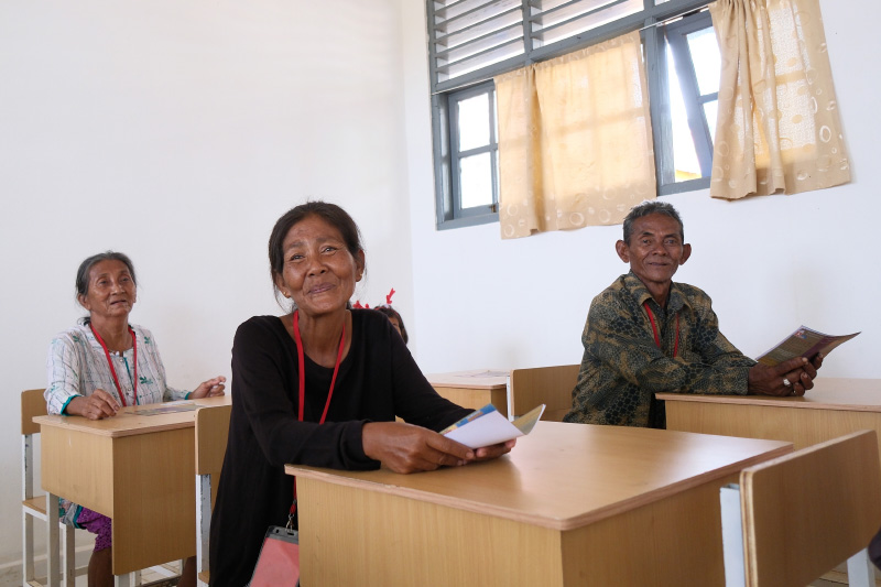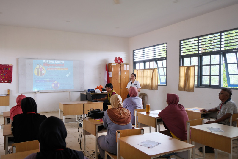 Ibu Sarinah (depan) mendengarkan penyuluhan pola hidup sehat.