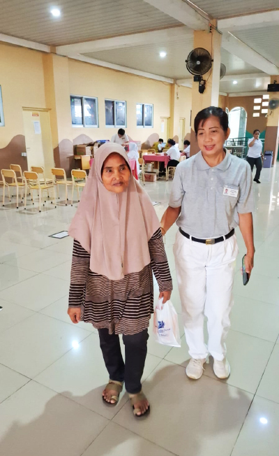 Wajah sukacita Ibu Wini setelah selesai berobat dan diantar pulang oleh relawan Tzu Chi.