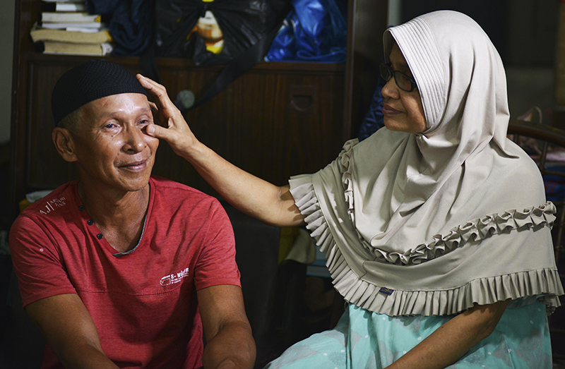 Ismardiyati mengusap mata kiri Masrul. Keinginan mereka berdua untuk untuk operasi katarak di mata kiri Masrul akhirnya terwujud berkat baksos kesehatan Tzu Chi.