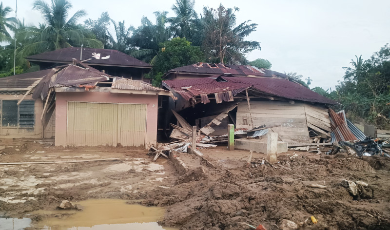 Banjir bandang yang melanda Kelurahan Rantau Pauh, Kecamatan Rantau, Kabupaten Aceh Tamiang mengakibatkan rumah warga serta insfrastruktur public banyak yang hancur terseret derasnya banjir.