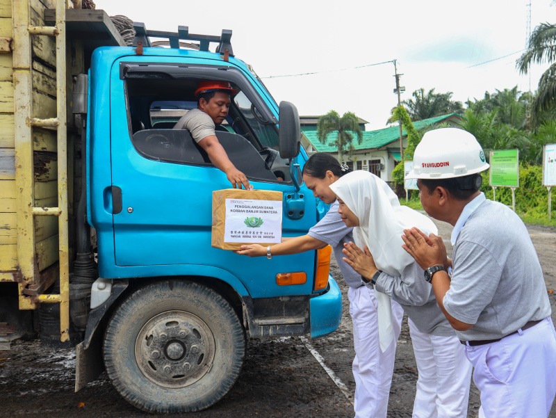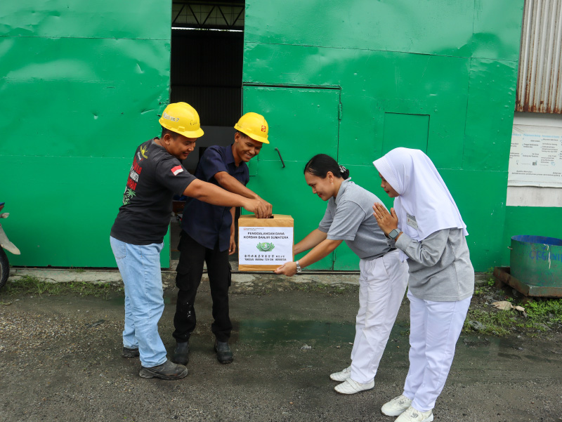 Relawan Tzu Chi melakukan penggalangan dana di depan gudang Unit Bumi Palma Mill, dengan partisipasi aktif para karyawan pabrik yang menyisihkan donasi untuk membantu korban banjir bandang dan tanah longsor di Aceh, Sumatra Barat, dan Sumatera Utara.