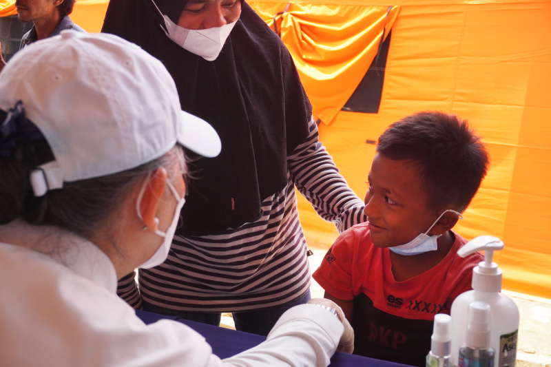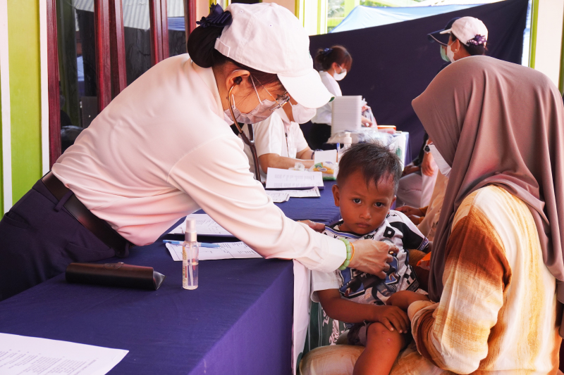 Aminah setia menemani anaknya saat berkonsultasi mengenai keluhan batuk. Ia memanfaatkan layanan kesehatan gratis yang diadakan relawan Tzu Chi di tengah keterbatasan akses layanan medis pascabanjir.