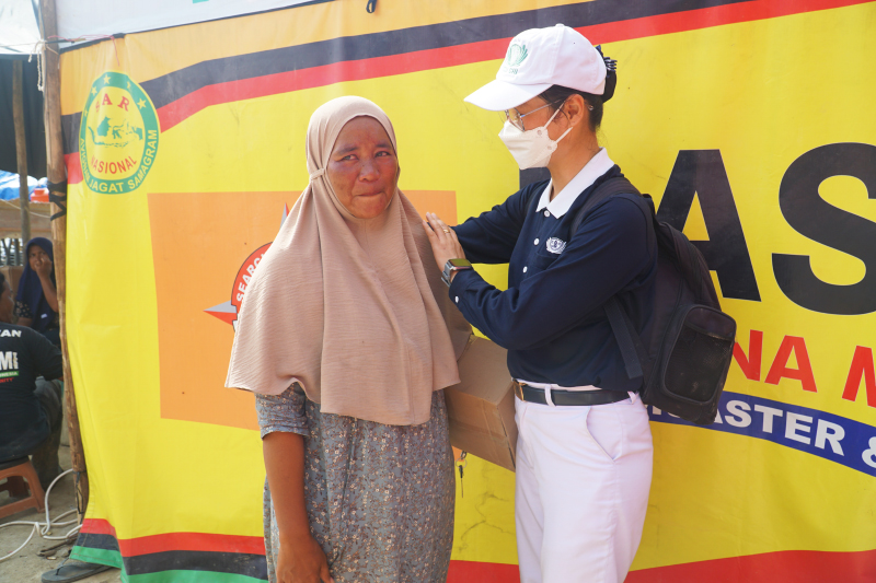 Nini, relawan Tzu Chi Medan memberikan perhatian kepada Diana, salah satu warga yang mengungsi di posko. Perhatian dan dorongan semangat sangat berarti untuk mereka yang masih trauma akan bencana yang terjadi.