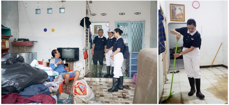 Relawan mendengarkan cerita dari Akiong, warga Komplek Deli Garden yang terdampak banjir. Selain mendengarkan ceritanya, relawan juga membantu membersihkan rumah Akiong, menyapu dan merapikan area yang sebelumnya terendam air.