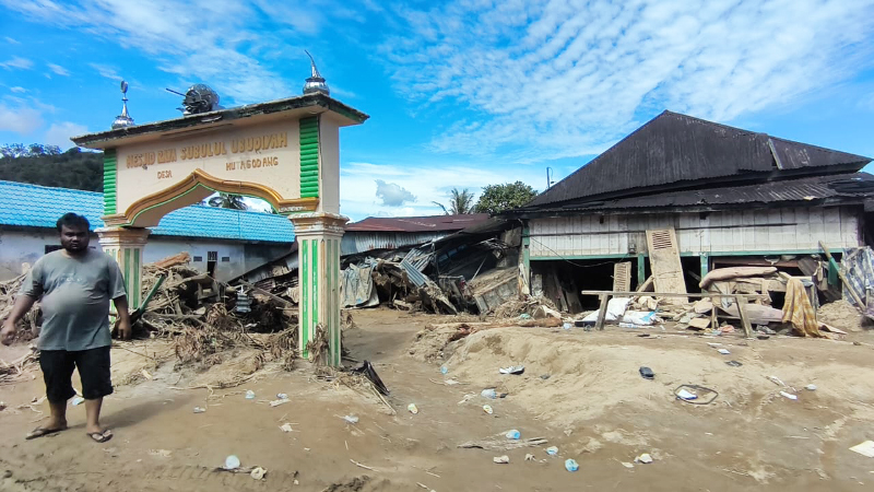 Seorang warga berdiri diantara bangunan masjid dan rumah-rumah yang rusak parah akibat banjir bandang yang menerjang Kecamatan Batang Toru Kabupaten Tapanuli Selatan, Sumatra Utara.
