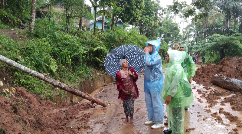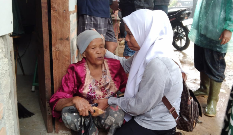 Relawan Tzu Chi Padang bersama Ibu Net melihat kondisi sekitar rumahnya yang terdampak bencana tanah longsor, yang mengakibatkan ia harus mengungsi.