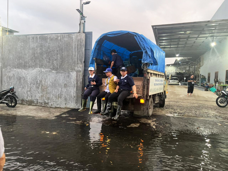 Dengan menggunakan truk, relawan Tzu Chi melewati genangan air untuk mendistribusikan bantuan untuk warga terdampak banjir.