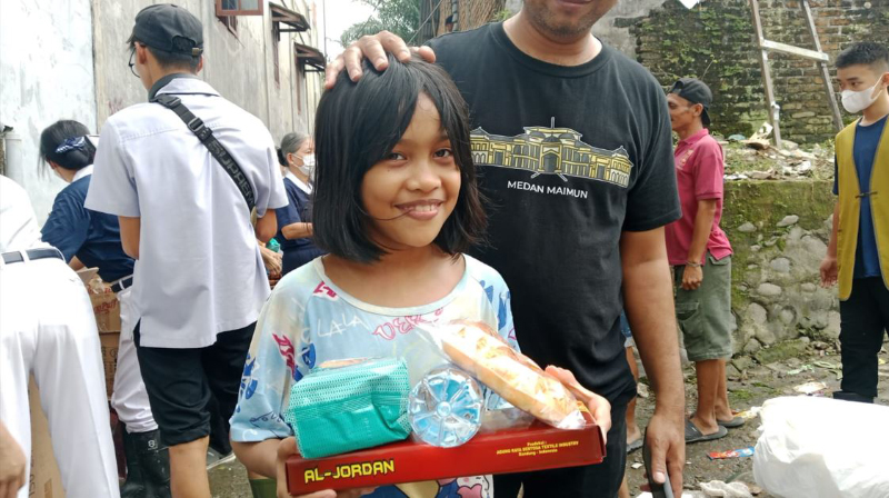 Senyum bahagia salah seorang anak saat menerima bantuan yang disalurkan Tzu Chi di tengah banjir yang belum surut.