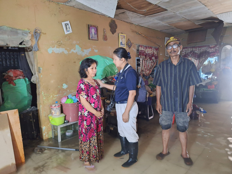 Relawan dengan penuh kehangatan mendengarkan keluh kesah Ibu Hafvah, salah satu warga yang rumahnya terendam banjir.