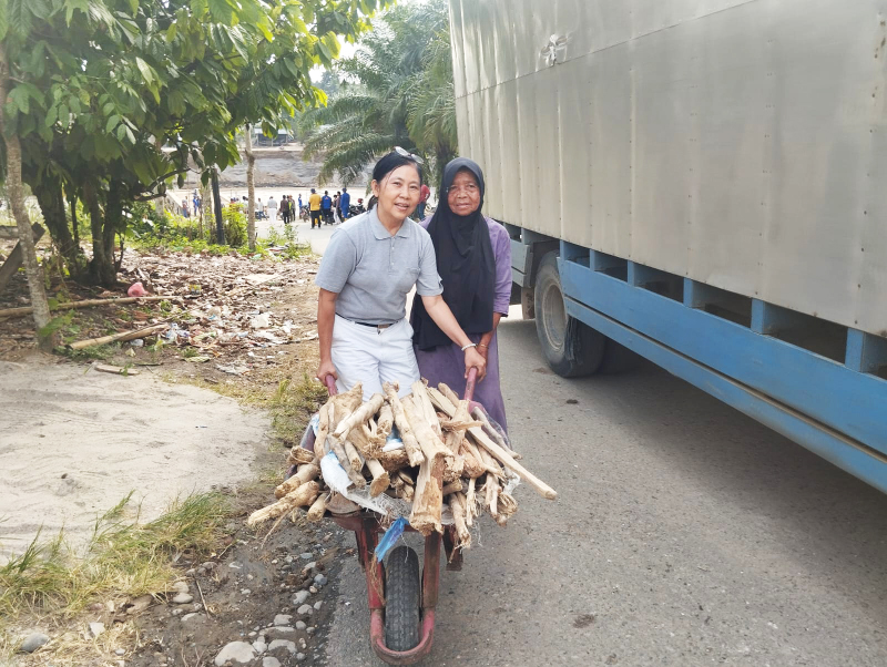 Nenek Khadijah bersuka cita dibantu oleh relawan Tzu Chi membawakan kayu dari tepi sungai untuk memasak.