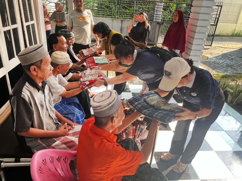 Pemberian selimut dan sarung kepada lansia laki-laki.