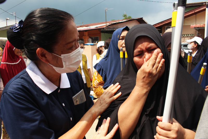 Rina warga Gg. Karang Sari menangis terharu dan didampingin relawan Tzu Chi saat relawan mengantarkan bantuan kepada mereka.