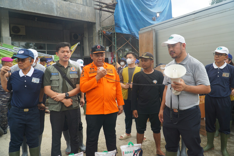 Dengan penuh syukur, relawan menyerahkan paket bantuan simbolis kepada warga terdampak banjir.