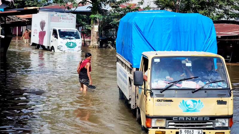Mobil truk membawa barang bantuan ke Tanjung Pura, melewati jalan yang masih belum surut airnya pasca banjir.