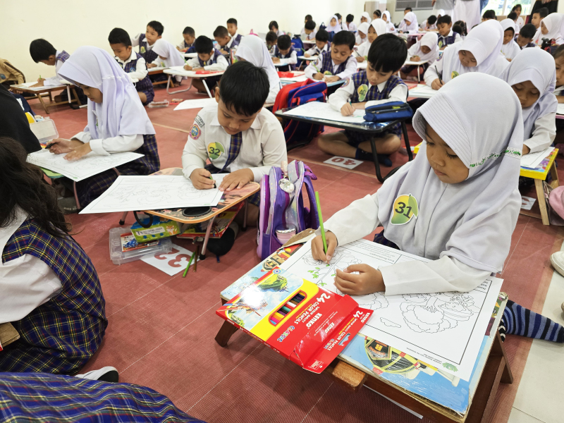 Relawan membagikan kertas mewarnai dan kertas gambar. Begitu aba-aba disampaikan, mereka segera sibuk dengan alat gambarnya masing-masing. Untuk mewarnai diberikan waktu 60 menit, sementara untuk lomba menggambar diberikan waktu 90 menit.