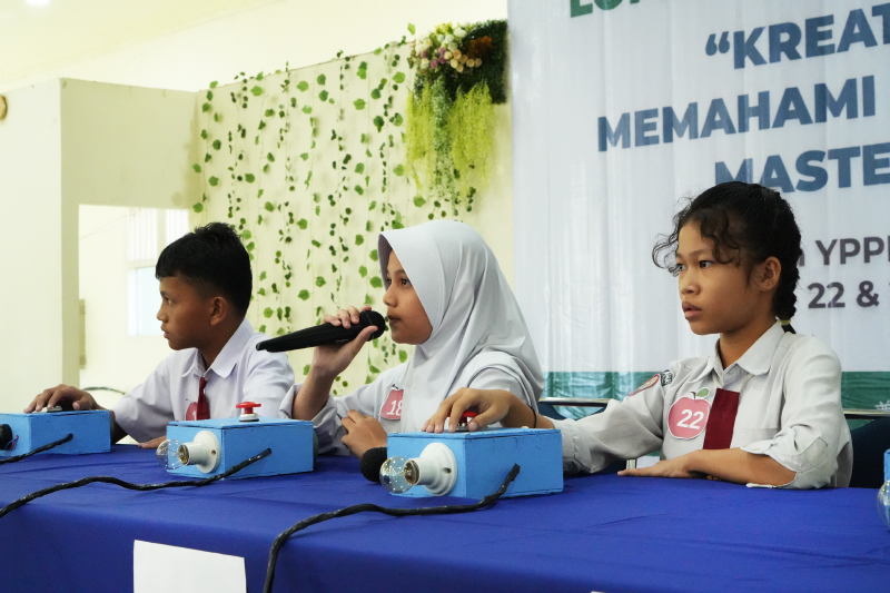 Seorang siswi tingkat SD sedang menjawab pertanyaan dalam kategori lomba cepat tepat yang diikuti siswa SD kelas 4-6 YPPI Perawang.