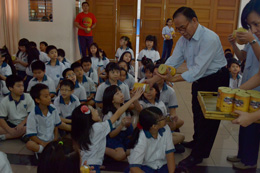 | “Kami berpikir bahwa melakukan sesuatu apabila dimulai lebih dini, lebih bagus. Seperti sekarang ini anak-anak masih polos dan kita tanamkan rasa cinta kasihnya pada sesama agar nantinya pada diri mereka akan tertanam sikap positif,” ujar Alwin Scrop Leonardi, PIC kegiatan SMAT. Sejak hari Senin 29 Juli hingga Rabu 31 Juli 2013, relawan Hu Ai (komunitas relawan wilayah) PIK, memberikan sosialisasi secara bergantian pada siswa kelas 1 hingga kelas 6 SD yang seluruhnya berjumlah 765 siswa. Antusiasme serta kepolosan anak-anak sangat kentara terlihat, terbukti dari pertanyaan-pertanyaan yang keluar dari celotehan mereka seperti; “Apakah celengan ini hanya untuk membantu yang agama Buddha?” atau “Sehari harus berapa banyak sumbang di celengan?” mendengar pertanyaan polos anak-anak, Adenan Shixiong dengan sabar dan telaten menjawab satu persatu pertanyaan tersebut. Yayasan Buddha Tzu Chi memang merupakan yayasan yang tidak mengenal perbedaan, membantu siapa saja yang membutuhkan bantuan, dan menyebarkan aliran cinta kasih bagi masyarakat, begitulah sekiranya yang dijelaskan pada anak-anak. Lebih lanjut Adenan memberikan contoh bahwa sekaya apapun seseorang, apabila bencana seperti kebakaran atau banjir datang maka kekayaannya tidak akan berarti.