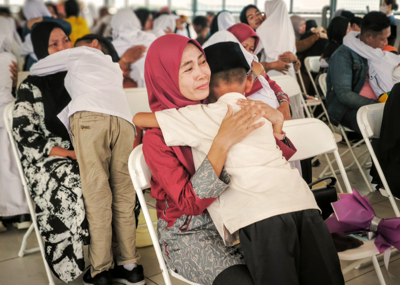 Murid-murid memeluk orang tua mereka sambil menitikan air mata, menghadirkan momen keharuan yang hangat dan tulus, memperlihatkan cinta kasih yang dalam antara anak dan orang tua.