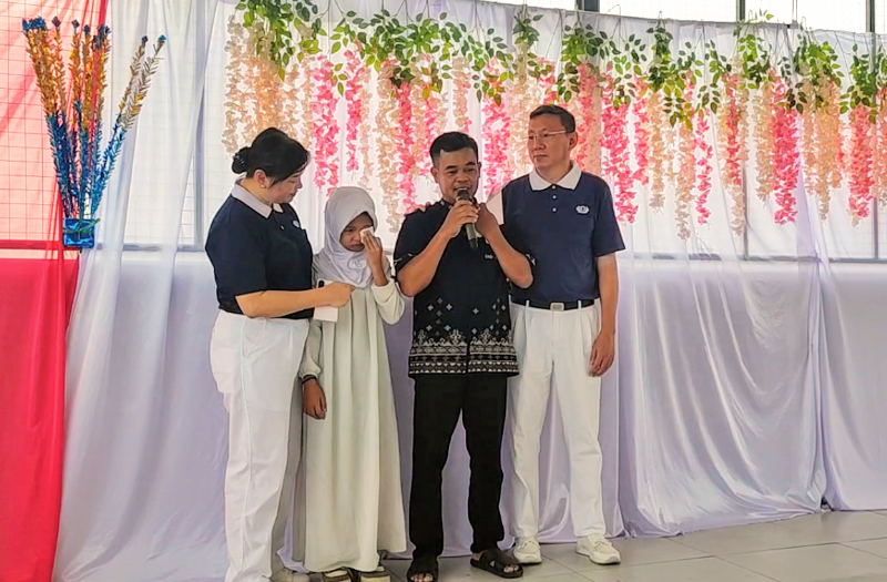Didampingi relawan, seorang ayah, Nadirin, bersama putrinya, Deliza, tak kuasa menahan haru saat membagikan kesan mereka tentang perayaan Hari Bakti yang menghadirkan momen penuh emosi dan kasih sayang.
