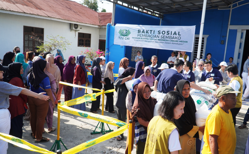 Minggu, 12 April 2026, hari masih pagi ketika 81 relawan Tzu Chi Medan komunits Hu Ai Mandala berkumpul di pelataran depan Wisma Kurnia di Jl. Tanom, Desa Tumpatan Nibung, Kecamatan Batang Kuis, Kabupaten Deli Serdang. Mereka tampak sibuk melakukan persiapan untuk kegiatan bakti sosial pembagian sembako bagi warga prasejahtera yang diadakan pada hari itu. Tenda didirikan, spanduk dan bendera Tzu Chi dipasang, alur keluar masuk dipersiapkan, beras 10 kg dan minyak goreng 2 liter satu per satu ditata rapi di atas meja yang telah disiapkan. Setelah semua persiapan selesai, para relawan siap memulai kegiatan.